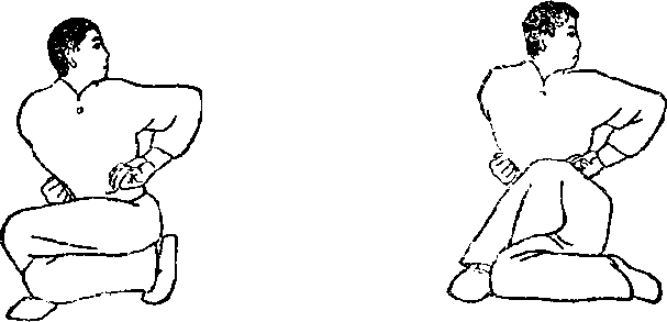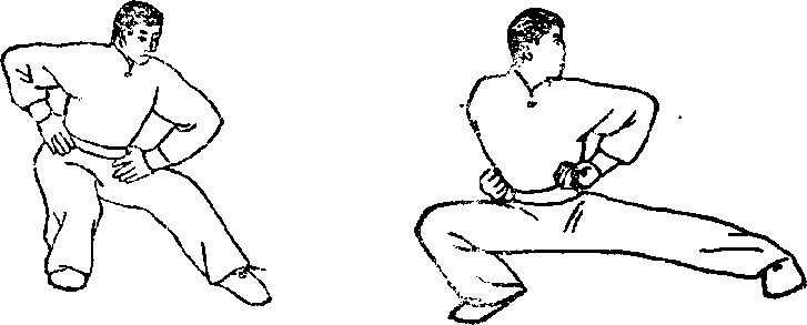 两脚左右开立右腿屈膝全蹲大腿和小腿靠紧臀部接近小腿全脚着地腿和膝外展左腿挺直仆平脚尖里扣全脚着地。两手抱拳于腰间眼向左方平视(图35)。仆左腿为左仆步仆右腿为右仆步。
