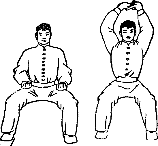 (1)马步站立两手握拳置于腰侧拳心向上两眼向前平视(图1)。(2)两拳变掌掌心向上从身体两侧上举到头顶上方然后十指交叉(图2),随后翻转掌心向上(3)。两掌缓慢用力向上托起身躯略向上抬同时配合