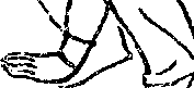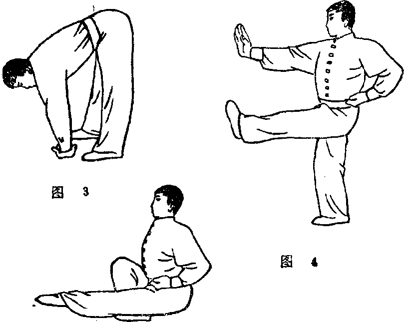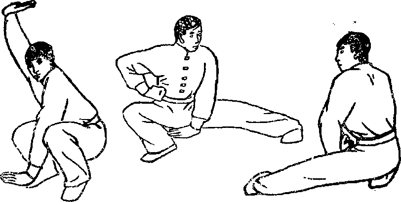 (1)双腿屈膝下瓣右手直臂上举于头上掌心向左手掌心向下直臂按于裆前(图6)。(2)左腿向身后仆地斜伸足尖内扣全脚掌着地〈图?)(3)左腿从身后作弧形前扫(4)左腿扫到正前方屈膝回收还原到第一动作。连做三次换右腿扫(图8)。