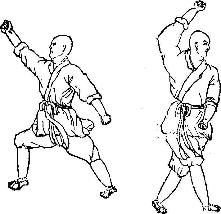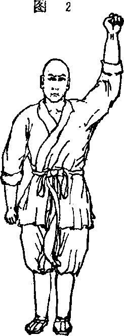 左拳平举向上至头顶略屈肘拳心向前眼睛平视(图4)。