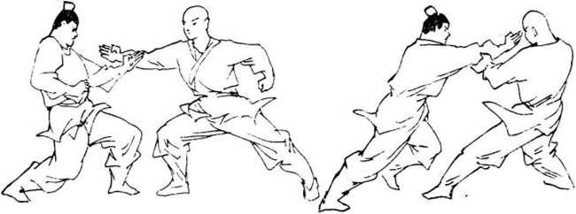 ② 甲上步撩阴,乙并步刺戳。上动不停,甲右脚向后退 一步,脚尖外撇,全脚着地。右腿屈膝下蹲;左脚微向后 撤,脚尖内扣,全脚着地。左腿膝部微挺成右四六步。退步 同时,身体向右稍转。右臂内旋,左手5指用力抓拉乙左肘 关节上侧麻穴,向左下用力牵拉;左臂外旋,右掌拇指挠侧 用力向左前撩击乙阴裆部位.指尖向前下,掌心向右上。日 视乙腹部。乙见甲招法锐不可挡,急忙向右跨步、左转身化 解。右脚尖内扣,全脚着地微使蹬劲。右腿膝部屈曲;左脚 向右脚弓处靠拢,脚尖内扣,全脚着地;左腿屈膝下蹲,全 身重心多坐于右腿上成扣步。与转身同时,右肩尖用力向前 碰撞甲左肘关节上侧。右臂内旋,右手指尖用力欲向前剌戳 甲裆部外生殖器官。指尖向左下,掌心向下;左臂随身体转