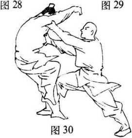 扣,脚跟掀起.小腿三头肌向后崩弹乙小腿肚;左脚随之蹬 地用力助其发劲.左腿挺膝伸直成右弓步。朋弹绊打同时, 两臂内旋,双掌根部用力扣打乙心脏。目涅乙面部(图 30).