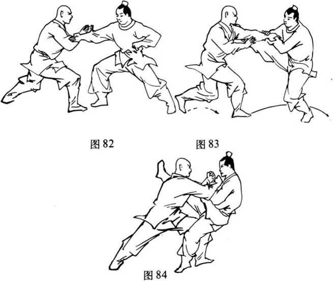 ③甲跨步崩抖,乙抓腕后撤。紧接上动,甲右闪身左拍 打化解乙攻势。右脚向前跨一大步,停于乙左脚后侧。右小 腿三头肌用力崩抖绊打乙左小腿。百脚尖着地,脚跟掀起。 右腿屈膝半蹲;左脚蹬地跟进,脚必外撇,全脚着地。左腿 膝部挺直成右弓步。崩抖绊打同时,右臂内旋,右拳根用力 猛扣击打乙心脏。拳面向前上,拳心向左;左臂外旋,左小 臂尺侧用力砍截乙右肘关节上侧。左拳面向前上,拳心向 右。目视乙胸部.乙见甲招法凶狠无法阻挡。快速将身体后 仰,左脚相继后退一步躲闪。右脚尖内扣,右膝盖用力撞甲 左胸部,欲挣脱撤回,左脚医外撒,全脚着地。左腿膝部微屈 支撑身体.后仰同时,两臂外旋,两手10指一齐向上用力 托抓甲双腕关节上则列缺、脉门处向后拉捋。目视前下方 (图 84).
