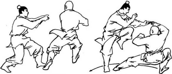 (3)招法要点:上步双点招法使用时要一手下点;一手 直戳,使对手不易逃脱。上步要快速,发劲要狠猛。侧身扫 腿要突然动作,不使对方知晓。扫腿与手部拍压要同时,上 下齐力合劲,敌人难逃法网。提腿要快,不快则被对方伤 害;劈头要狠毒,不毒则不准,敌人易躲闪。鞭腿横踢要适 时、突然,下俯身要疾,不疾则迟误,迟误则命不保也.转 身、撑地、扫腿动作要连贯协调,一气呵成。站左扫右腿,
