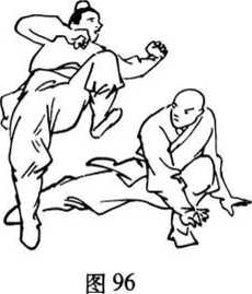 撑身体;与转体同时,左大腿带动小腿向右横扫。左脚面绷 紧用力向右鞭打甲头右侧太阳死穴。鞭打之时,右臂内旋屈 肘回收,右拳停于体侧。拳面向左,拳心向下;左臂外旋, 小臂外缘用力下挂停于左腿上侧、拳面向前,拳心向右。目 视甲头部太阳穴处。甲见乙横扫鞭腿招法太猛。快速向左下 俯身,双手扶在地面上躲闪.俯身同时,左脚尖外撇,全脚 着地。左腿屈膝全蹲;右腿伸直平仆地面,右脚尖内扣,里 脚背用力向前扫踢乙右脚跟部(支撑身体的腿)。与扫踢同 时,两臂内旋,两掌一齐推撑地面助其发力。目视右下方 (图 96)。