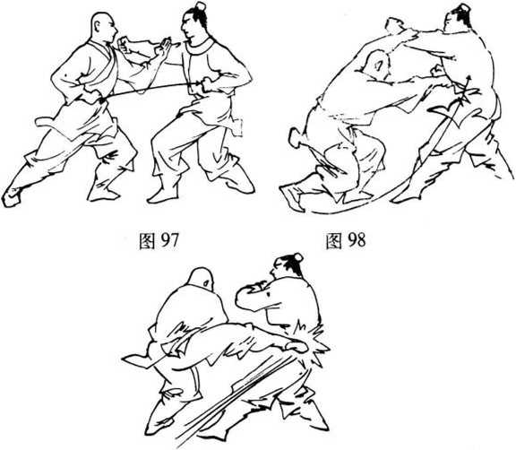 ?②乙拧身左勾,甲潜身掏心。紧接上动不停,乙身体右 转。左脚向前侧跨一步,脚尖内扣,全脚着地。左腿膝部屈 曲;右脚蹬地斜跟,脚尖外撇,全脚着地。右腿膝部微曲成 左四六步。右转体的同时,左臂内旋,左拳面用力弧形向前 上勾打甲右太阳死穴。拳面向右,拳心、向卜;右臂外旋曲 肘回收,右拳停于胸前.拳面向前上,拳心向左。目视甲右 侧。甲急忙左转身低头躲闪。左脚侧跨半步,脚尖向前,全 脚着地。左腿屈膝半蹲;右脚蹬地斜跟,脚尖外撇,全脚着 地。右腿膝部屈曲F跪成左跪步。上步同时,身体下潜左 转。左臂内旋,左手5指用力向上反抓乙左腕关节外侧斜 捋;右臂内旋,右拳面用力向前上方宜打乙心脏(俗称黑虎 撞心捶)。拳面向前上,拳心向内。目视乙胸部(图98)。