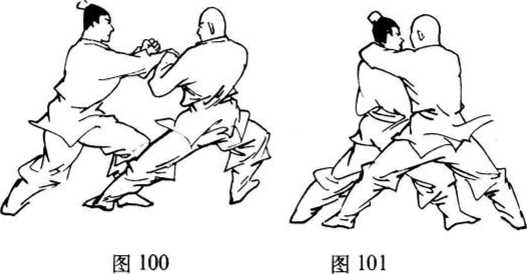 ② 乙上步绊摔,甲刁腕锁喉。上动不停,乙右脚向前一 步停于甲右腿侧,小腿三头肌用力绊打甲小腿。右脚尖内 扣,脚跟掀起。右腿屈膝下蹲;左脚蹬地跟进,脚尖外撇, 脚跟掀起成右四六步。上步同时,乙左手5指用力抓甲右肩 关节上侧;右拳变掌,掌根用力推击甲左肩欲将甲摔跌。目 视右前方。甲体向左转,身体微向前俯。右脚向前垫半步。 脚尖内扣,脚跟掀起,右腿膝部微屈,右大腿用力碰撞乙大 腿使之站立不稳;左脚尖外撇,全脚着地。左腿屈膝下蹲成 右四六步。碰撞同时,右臂前穿后大小臂屈曲折叠紧锁乙脖 颈处;左臂内旋,左手5指用力扣抓乙右腕关节上侧脉门向 左下方捋拉。目视乙面部(图101).