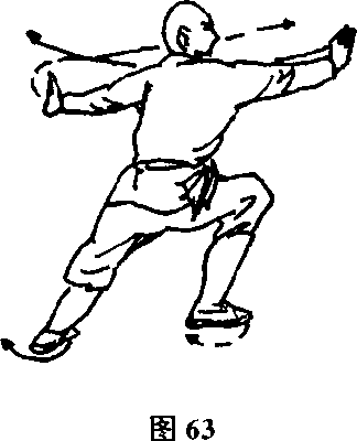 上动不停,抬左脚向前上一步,屈膝成左弓步,同时推左掌, 收右掌(见图62)。上动不停,左弓步不变,两手回胸前划弧,然 后向前后分别推出,臂与肩平,两掌心向外,目视右掌(见图63)。