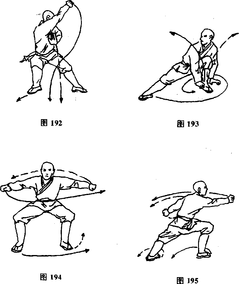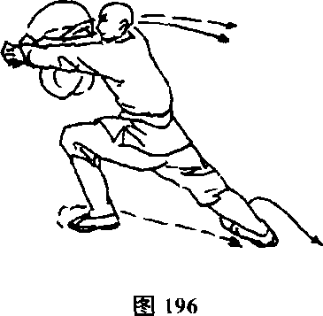 两脚碾地,体左转90度,右脚前上步屈膝成右弓步,右拳由 右前方冲击,左拳向后甩击(见图195)。