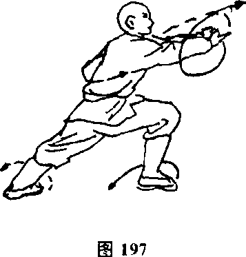 两脚碾地,体右转180度,上右脚成右弓步,两拳由后向前 方冲击,目视两拳(见图197)。