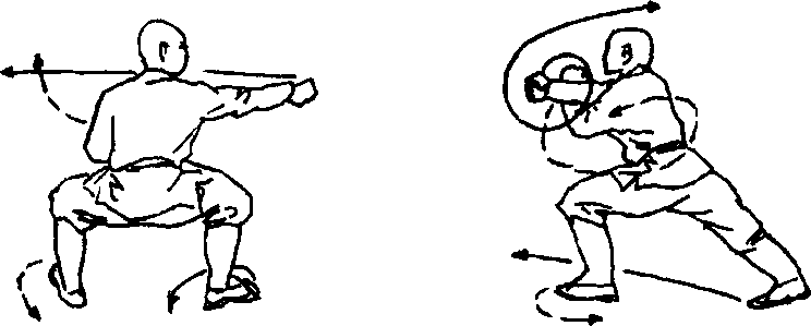 两脚碾地,体左转90度.震右脚然后两腿变马步,右拳向右 侧冲击,奉心向下,左拳屈肘抱于腰间,目视右拳(图198)。