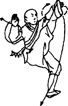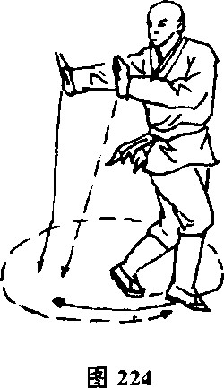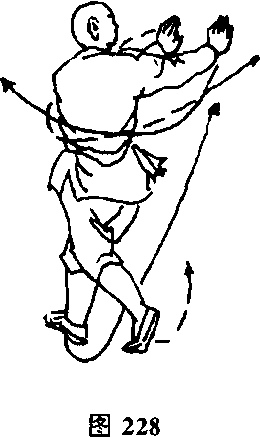 起身,体左转90度,然后再起跳,抬右脚向前向上弹踢.当 全身腾空时,出右手拍击右脚面(见图226)。