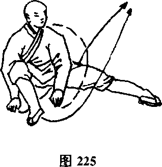 上动不停,抬左脚向左侧一步,右腿全蹲,使两腿成左仆步, 两手下按于右脚前两侧,抬左腿由后往前扫一周,目视左侧(见图 225)。