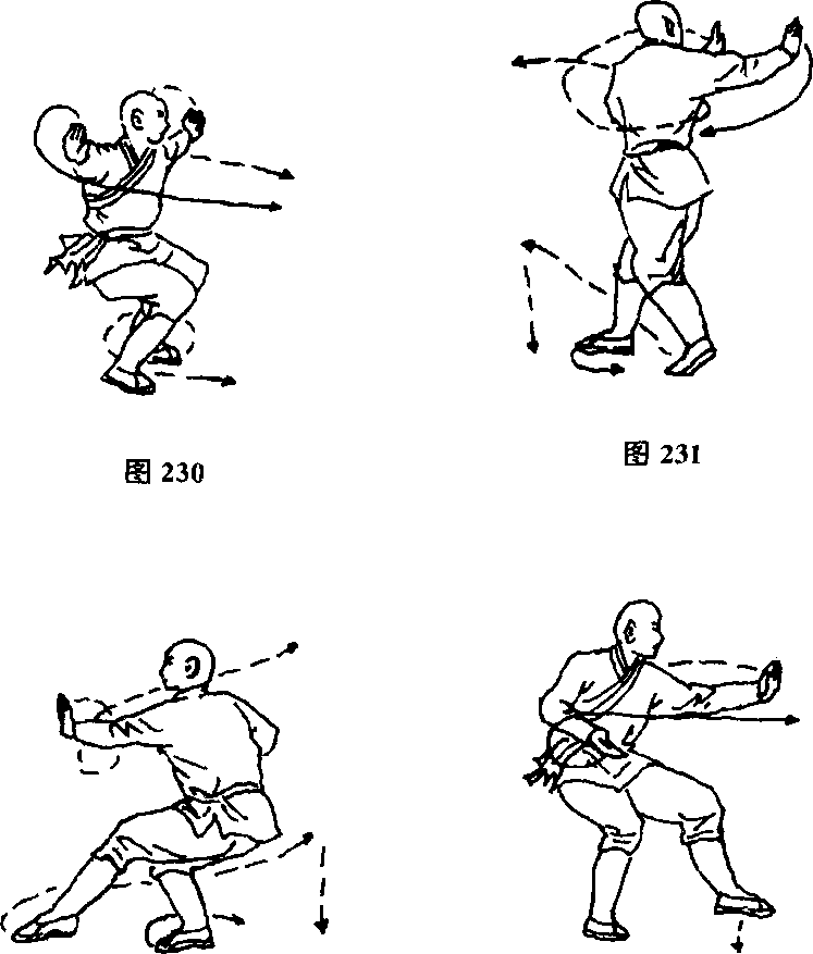 接上动作,抬右脚向左翻身,体左转180度,两脚腾跳,当 全身腾空时,出左手拍击右脚内侧,目视右脚(见图229)。