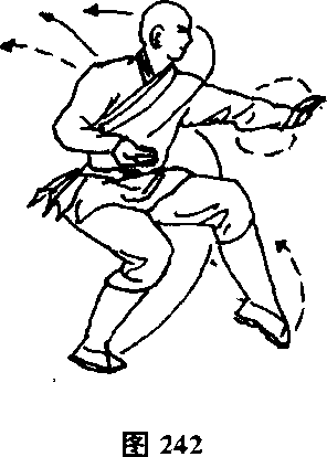 抬右脚向右转身跳步(右体转180度),转身后震脚,左腿落 于右腿内侧一步,左腿屈膝成左虚步,左手向左侧前方推出,右 手屈肘,掌端腰侧,目视左手(图242)。