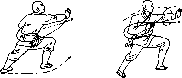 右脚前落一步,体左转身180度,抬右脚前上一步,成右弓 步,右掌向前猛揣,掌心向前,左掌屈肘端于腰左侧(见图244)。 再抬左脚向前上一步,屈膝成左弓步,左掌向前猛揣(见图245)。