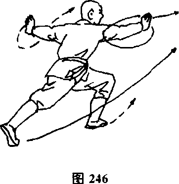 上动不停,左弓步不变,两手回胸前环抓,右掌向前,左掌 向后同时推出。目视右掌(见图246)。
