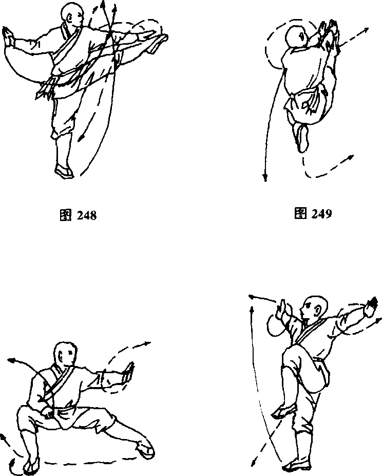 起双脚,抬右脚向前弹踢,当全身腾空时,出右手向前拍击 右脚面(见图247) 0