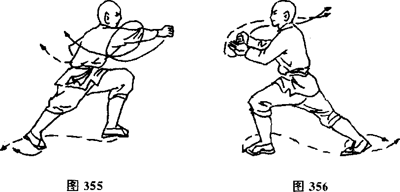 起身,两脚碾地,体左转90度,两腿成左弓步,两掌变拳, 右拳向前冲击,拳心向下,左拳抱于腰间,目视右拳(见图355)。