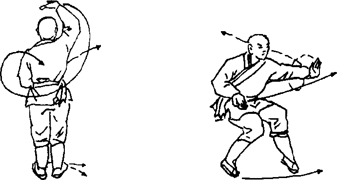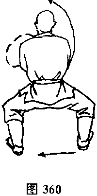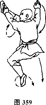 抬右脚前上一步,两脚起跳,向左转180度,抬右脚左弹摆. 当全身腾空时,出左手拍击右脚掌内侧(见图359)。