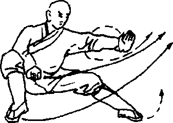 右脚落于左脚前一步,震右脚,体左转180度,使两腿变成 左弓步,左手向前抢出,右手屈肘向前砍切左掌,目视左手(见图 364)。