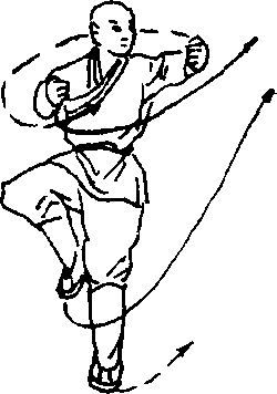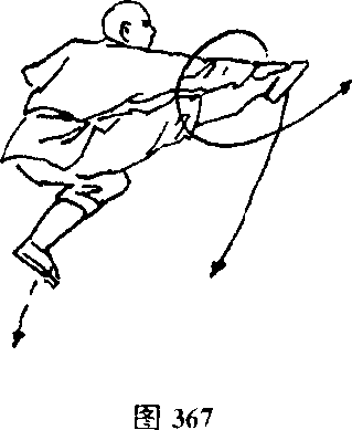 右脚踏实,双足跳起,体左转180度,右脚向前弹踢.当全 身腾空时,出右手拍苫右脚而(见图367 )0