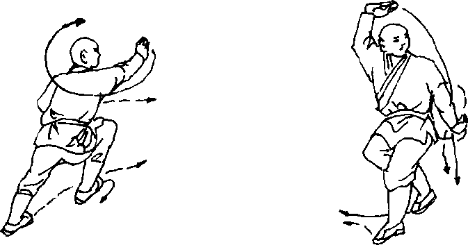 两脚碾地,体左转90度,左掌由前向后抡,右拳以肩关节为 轴,由后向上再向前抡臂前冲,左拳以左肩关节为轴,由后向上再 向前抡臂一周,然后收回腰间,右拳前冲,目视前方(见图373)0