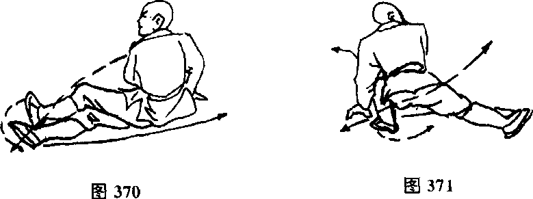 两脚不动,体右转180度.两手按于右脚前外侧,两脚同时向 左卧跳,由左向右弹翻,落成右侧伏地插腿式,目视两脚(见图 370)。