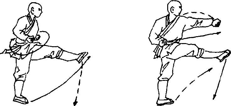 右拳变掌向前抓,然后变拳屈肘抱于腰侧,同时抬右脚向前 弹踢,左拳向前冲击,掌心向下,目视左拳(见图375)。