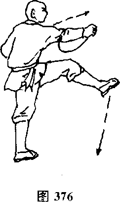 上动不停,抬右脚向左弹摆,体左转90度,同时出左手向前 拍击右脚,目视两手(见图382)。