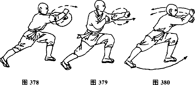 再冲左拳,右拳护左臂内侧(见图379)。
