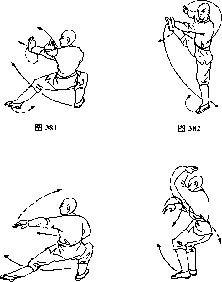 右脚不落地,向右转身跳步,落地后,震右脚,使两腿成右 低势弓步,两手同时向前抓,然后左掌向左掠,右手屈肘后缩掌 变拳,抱于腰侧,目视在学(见图383)。