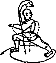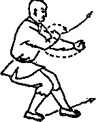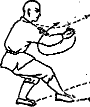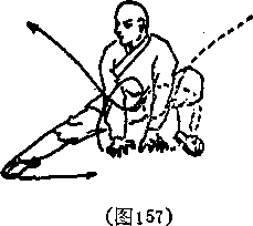 上动不停左腿全蹲右腿伸直变为右仆步两掌按于左腿内侧地上以左脚为轴抬右腿向左(体左转度)扫一周(见图157)。