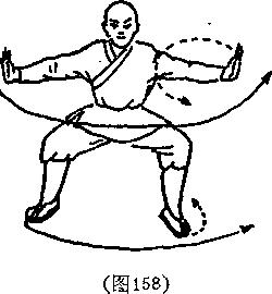 上动不停收右腿两腿屈膝成马步两掌回胸前同时向两侧推出掌心向外目视前方(见图158)口