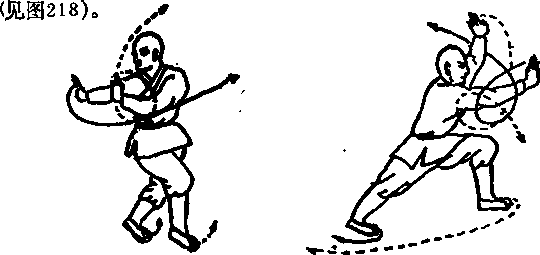 步使两腿成插步,两学随身由左向右侧推出目视右侧(见图224)母