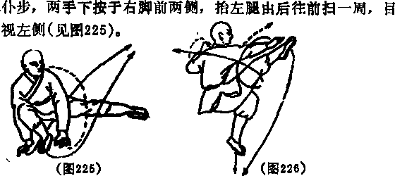 左脚后退一步,体左转180度,再抬左脚向后勾踢同时出右手向后拍击左脚底左手由下向上撩架于头上左侧目视后方(见图221工