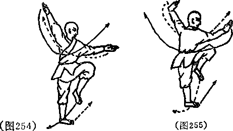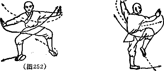 两脚碾地体左转90度左腿提膝同时左手由前下方向上再向后划右手由后上方向前方划目视右手(见图253)口