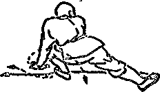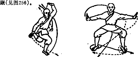 上动不停,向右翻身跳步(体右转度)在腮仝幽右腿仆地两手下按于左脚两恻(见图258)。
