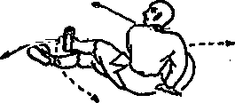左跃两腿成插步形卧地左脚在上右脚在下使下身着地耳视左恻(见图259)。