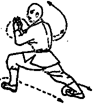 接上动作右脚下落左脚外侧后半步,使两腿成捶步再