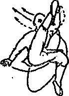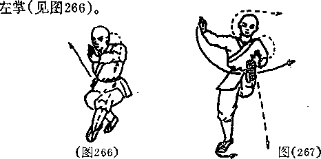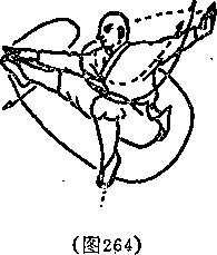 抬右脚向左转身弹摆当全身腾空时出左手向右上方拍击右脚掌内侧口视右脚(见图265)。