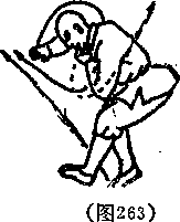 上动不停尸体左转90度左脚山后向前上半步两腿半蹲两手屈肘上身前伏右手向前掠左手屈肘护咽目视前下方(见图263)