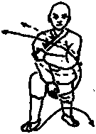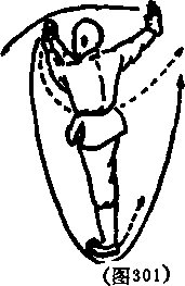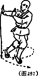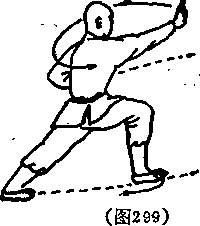右脚向后退-步变左脚为虚步右手由前向后上方撩然后屈酎竖腰右侧左手向前推出掌心向前两腿微蹲目视前方(见图294)。