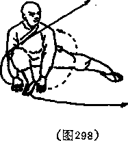 上动不停抬左脚向左一步成仆步,两手向胸前右腿两侧下按然后以右脚为轴抬左脚由后往前扫一周(见图298)。