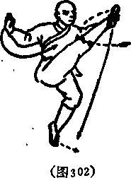 抬左脚向前弹踢向前落一步,体左转9。度成左弓步,两手在胸前环弧然后右掌变拳向前方揣击拳心向下,左掌由下向上架于头上前方目视右拳(图295