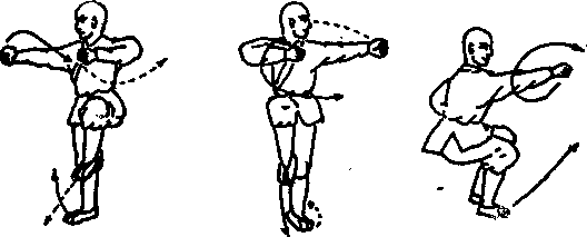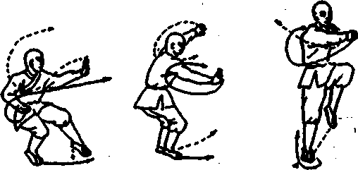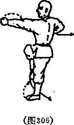 右脚落于左脚前外酒双脚起跳,抬右脚向左旋摆当全身脚空时出左手拍击右脚内侧(见图302