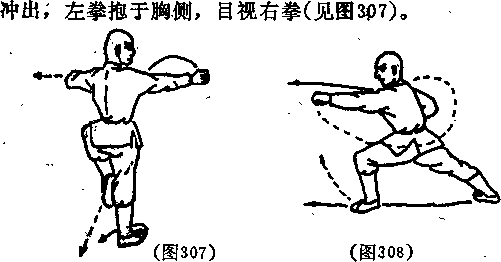 抬左脚向左落一步体左转90度成左弓步左拳向左侧冲出右拳抱于腰目视左拳(见图308)。