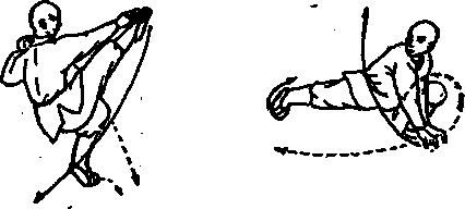 右脚落左脚后一步体右转90度左腿全蹲,右腿伸直成仆步两手按于左脚前两侧以右脚为轴右腿经右恻往后扫半圈(见图观