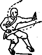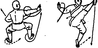 两脚起跳,抬右脚向左(转体270度)腾摆,当全身腾空时出左掌拍击右脚掌内恻。右手向右后恻撩出(见图321)