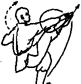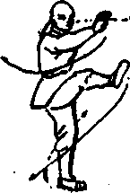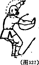 (图323)(图323)右脚左旋转落地后抬左腿提膝,用两手由前向下反击左膝盖上部然后由前向后甩成勾手(见图322)。左脚不落地,抬右脚向前弹踢当全身腾空时出右手拍击右脚而(见图323)